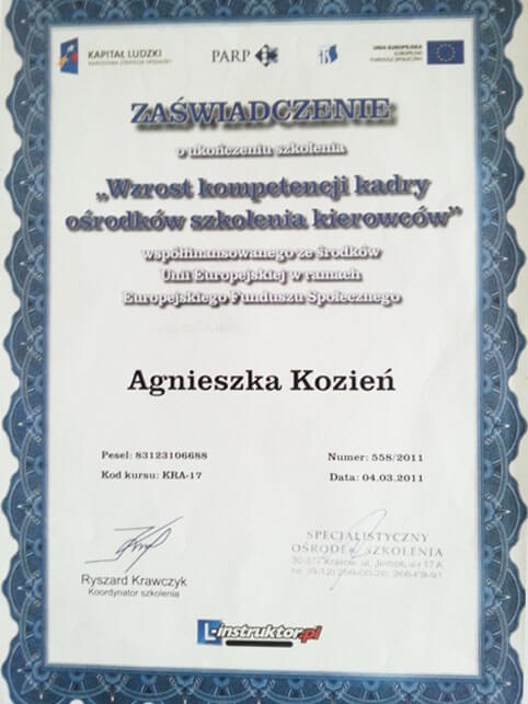 "Jestem bardzo zadowolona z kursu, udało m się go zdać za pierwszym razem. Super instruktorzy!" Agnieszka